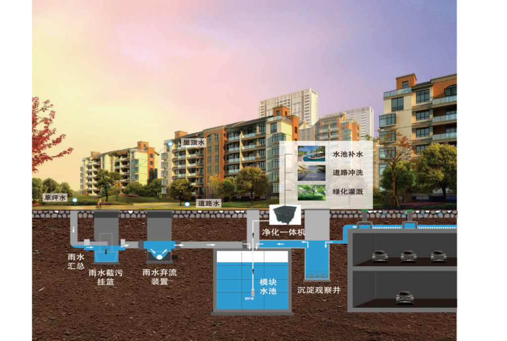 沪望屋面、市政道路综合雨水收集系统采用先进的地下模块化蓄水技术,通过科学的雨水收集、净化、储存和回用流程,将自然降水转化为可利用的宝贵资源:
